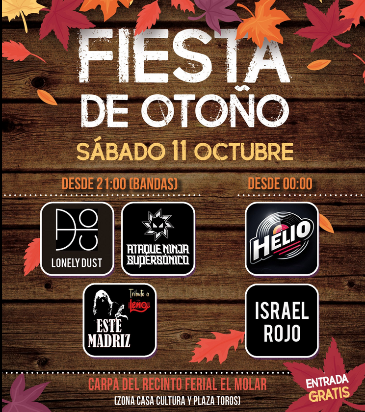 El próximo sábado día 11 El Molar celebra la Fiesta de Otoño en la Carpa de su recinto ferial, en donde la entrada es gratuita y se puede disfrutar la música de grandes grupos de rock.