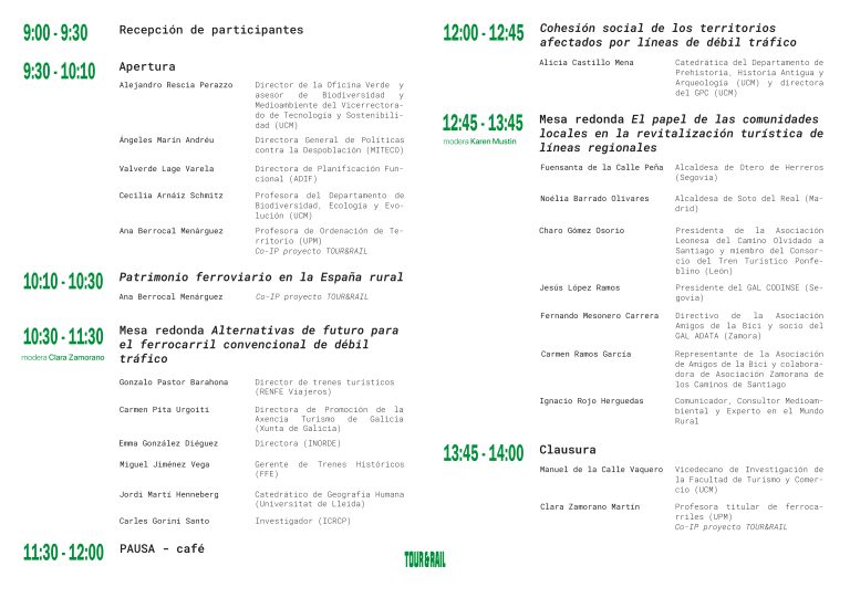Durante la mañana, escucharemos a diferentes representantes que han intervenido en el desarrollo del proyecto, asistiremos a mesas redondas de expertos que han trabajado y siguen trabajando acerca del futuro de las líneas de débil tráfico en el contexto de España y habrá oportunidades para interactuar con personas que conocen de primera mano el territorio y las características sociales y económicas de los lugares por donde cruzan las líneas